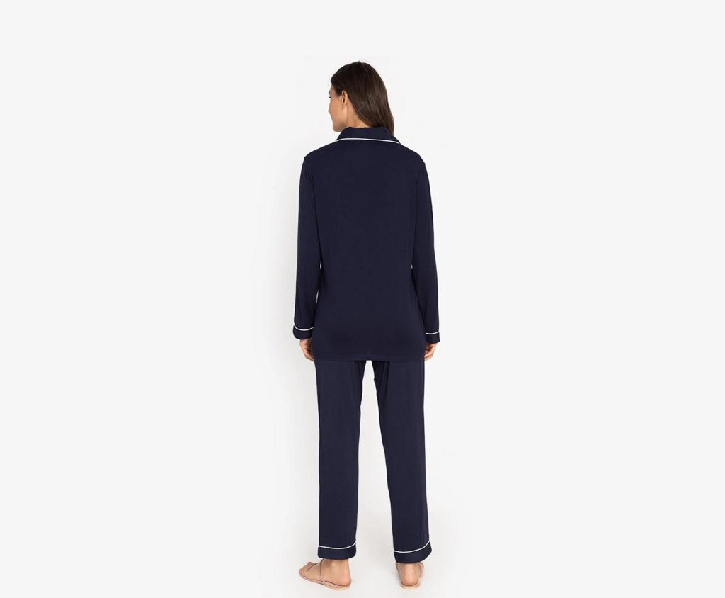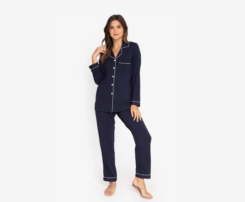 The moment you lay eyes on this pajama set, you notice the rich navy blue hue, subtly elevated by crisp white piping that traces the cuffs, collar, and hems with precision. It’s classic, minimal, yet profoundly chic. Whether you’re lounging in your sunlit bedroom on a lazy Sunday morning or hosting a cozy wine night with your closest friends, this set feels appropriate, flattering, and refined.